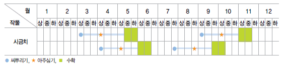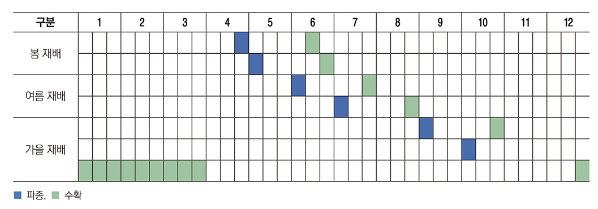 봄 재배 : 4월 말∼5월 초에 씨를 뿌려 6월 중순∼말까지 수확