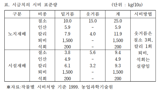 · 시금치는 짧은 기간동안에 급속히 발육하므로 밑거름에 중점을 두고 시비하되 웃거름도 작형에 따라 서 2~4회 정도 주도록 해야 합니다. 특히 인산과 칼리의 부족은 수량이나 내한성, 품질 등을 저하시키 는 요인이 됩니다.